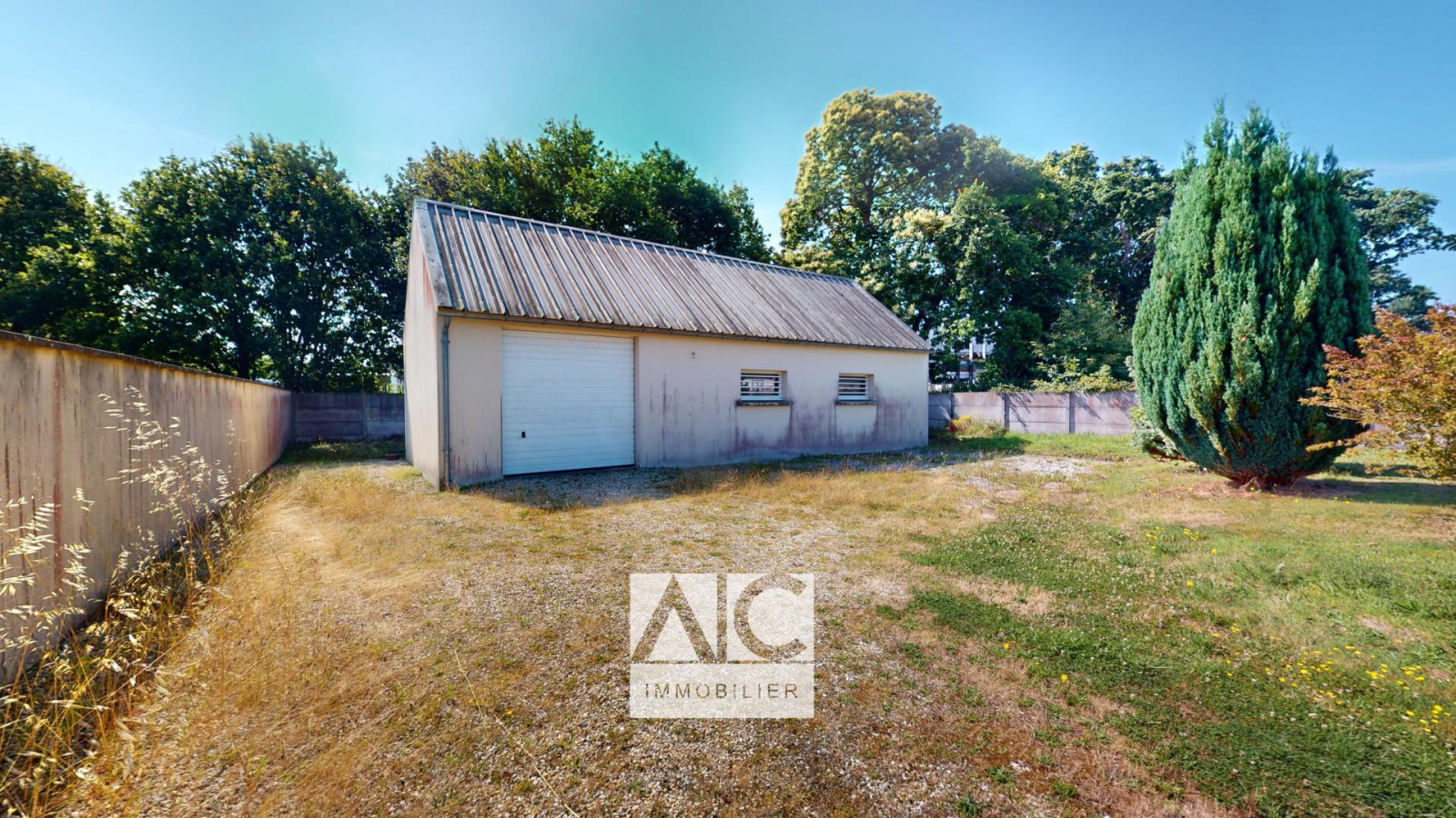 EXTÉRIEUR : Terrain clôturé de 1412m2 / Dépendance maçonnée de 80m2 avec étage et sa porte sectionnelle (hauteur 2,80m)
